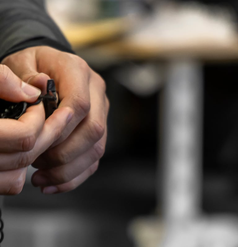 Les mains empoignent le manche